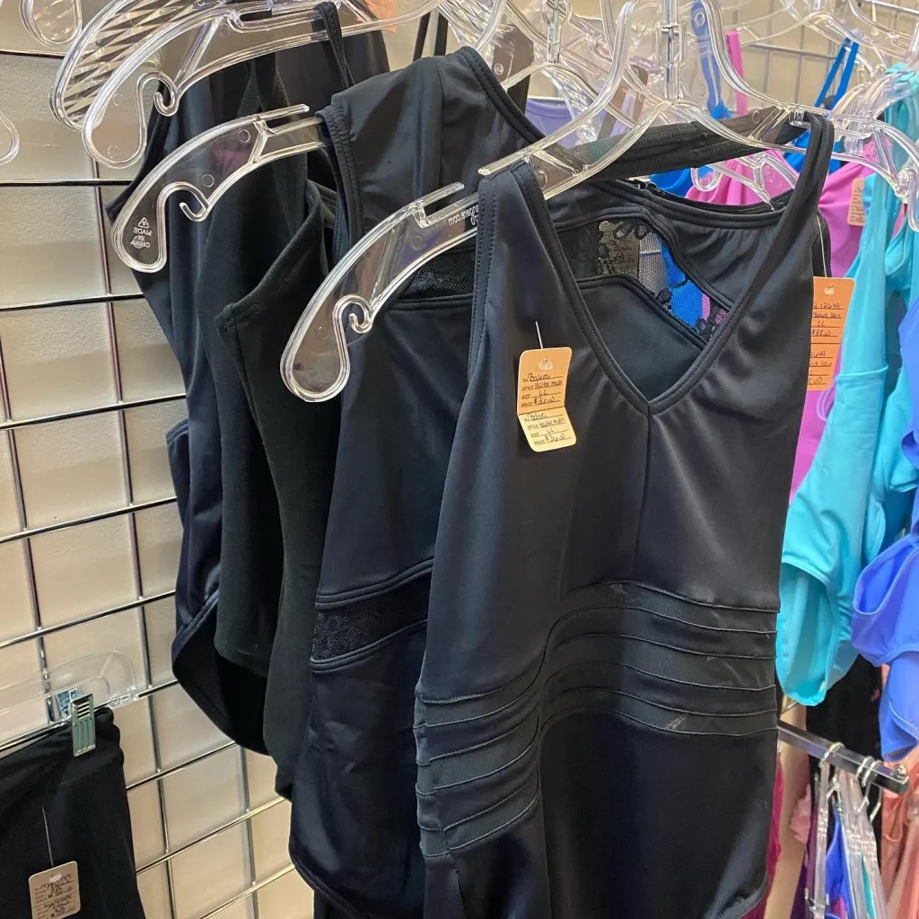 Dance Apparel: A variety of leotards, tights, and skirts in multiple colors and styles suitable for both practice and rehearsal.