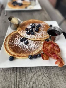 Sprinkle pancakes! 2 fluffy pancakes with whipped cream and sprinkles. Also includes applesauce or Go-Gurt and kids drink.
